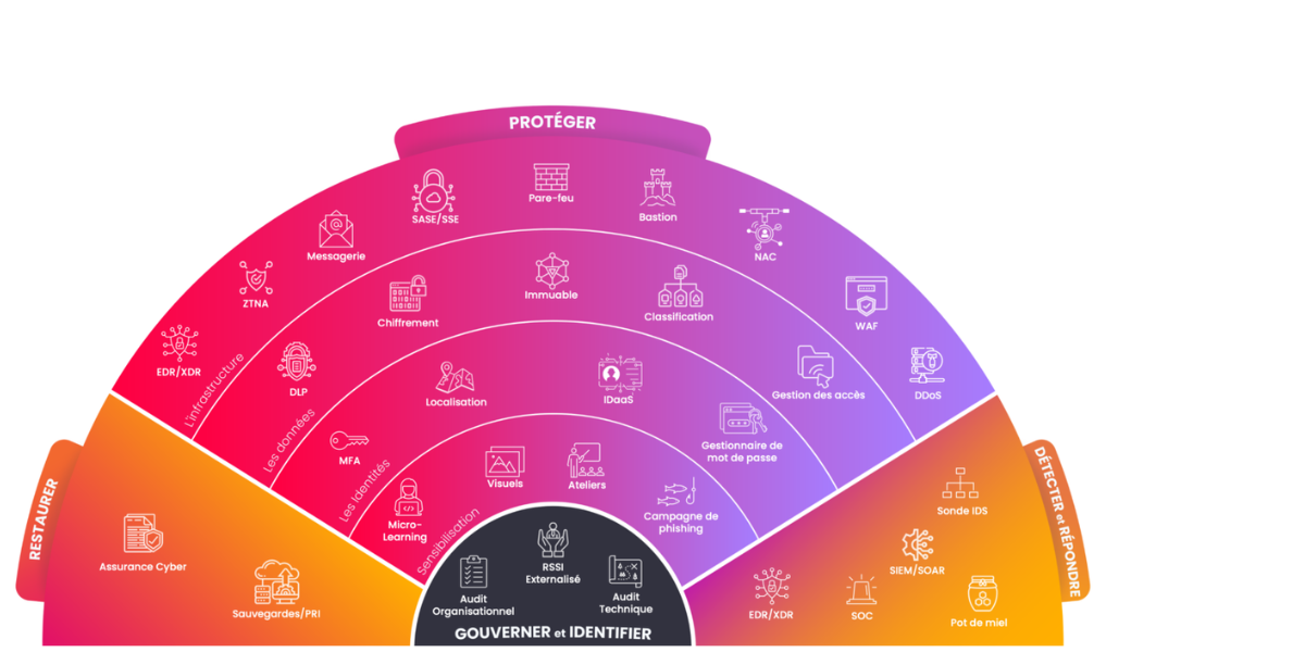 Une bonne stratégie de cybersécurité passe par une démarche globale. Elle inclut donc des services cloud ou on-premises, nécessaires à la sécurisation d’une infrastructure ou d’applications métiers : firewall, passerelle sécurisée (Bastion), EDR, filtrage des emails, etc.