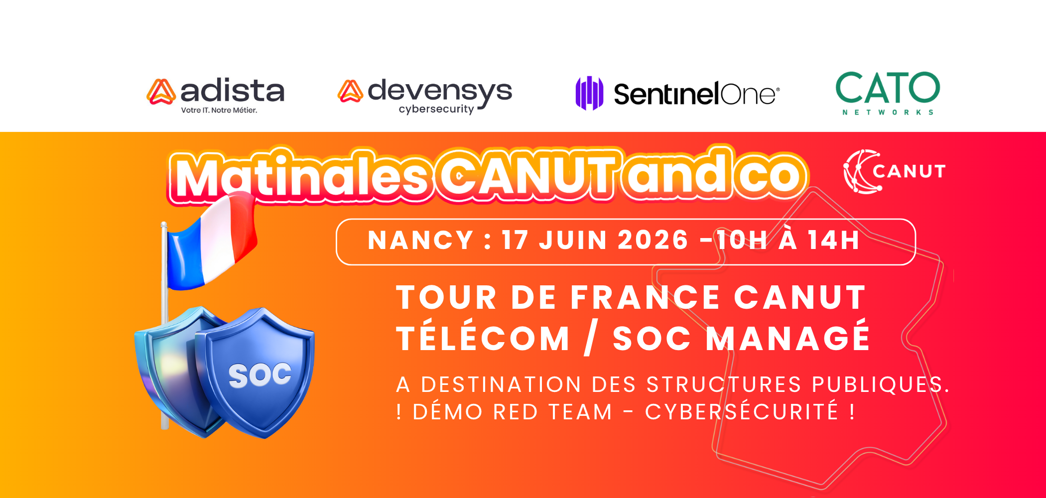- 10h30 : Les enjeux numériques pour les structures publiques, des lots CANUT Telco et SOC managé opéré en France). Cas d’usage et paroles d’experts partenaires, CATO Networks, SentinelOne…